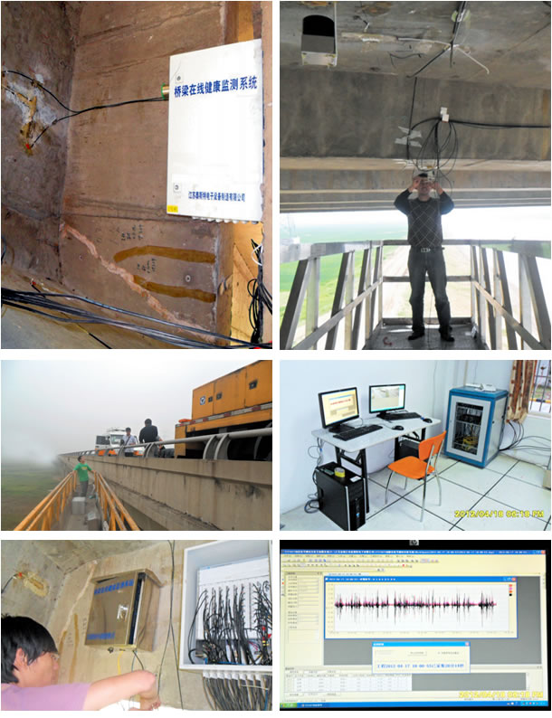 新沂河大桥位于京沪高速(G2)沐阳境内,京沪高速车流量较大,特别是重型货车,因此桥梁的各部位的健康状态需要实时监控。此次监控关注桥梁右幅第九联和第十一联的跨中和边跨位置。公司于2011年底开始着手新沂河大桥健康监控系统的设计工作,2012年年初开始进行现场传感器的布置、走线以及设备调试等。 此次监测2个损伤较大的断面,分别为上海往北京方向第六跨的第九联和第十一联。 整体系统分为应变测量、振动(动位移)测量、温度测量共3个子系统,应变测点共计88个,温度测点10个,动位移测点8个。设备采用TZT5961在线监测分析系统,根据一年多的监测数据,该桥在2013年8月进行加固维修,新的监测系统共256测点也已投入使用。
