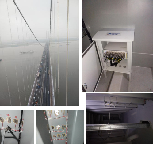润扬长江大桥位于江苏省镇江、扬州两市西侧,为中国第一大跨径的组合型桥梁,全长为35.66公里,桥面平均宽31.5米(行车道宽30米),全线采用双向六车道高速公路标准设计。 建设润扬大桥正交异性板桥面系服役状态监测系统,能掌握正交异性板桥面系使用参数,实时、长期评估各种结构的服役状态,为养护维修提供基础数据,支撑钢桥面铺装养护工程,包括新一代养护重置结构和材料设计、钢桥正交异性板结构设计和补强设计。为正交异性钢桥面板铺装体系运营管理、养护维修、安全和可靠性评估等提供依据。系统采用TST5963在线监测系统,共44个应变花测点、8个位移测点、6个温度测点。通过光纤传输到监控室进行实时健康监测。