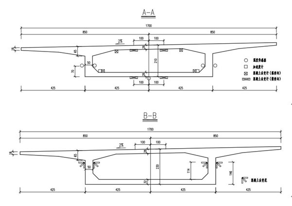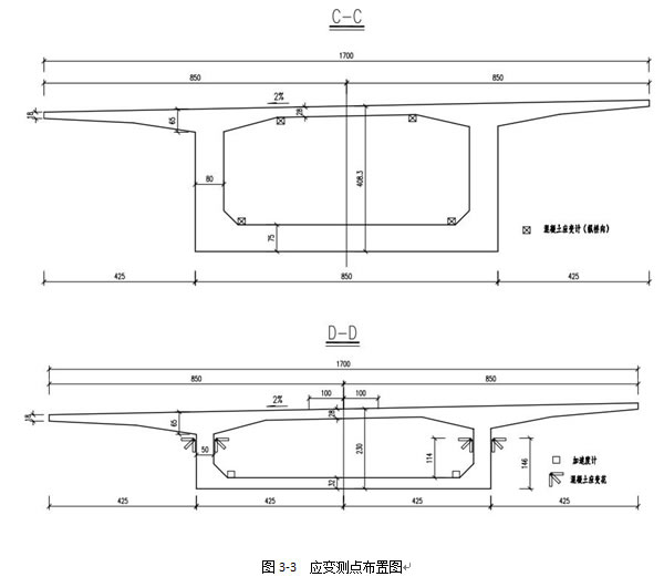 部分预应力混凝土组合箱梁既是形成连续梁桥的主要构件之一,同时又直接承受着车辆荷载的作用,通过对主梁各控制截面应力(应变)进行监测,不仅能直接了解各测点处的应力(应变)状态,而且为总体评判桥梁的安全性和耐久性提供依据,而且还能通过控制点应力(应变)状态变化来发现桥梁结构状态的变异。