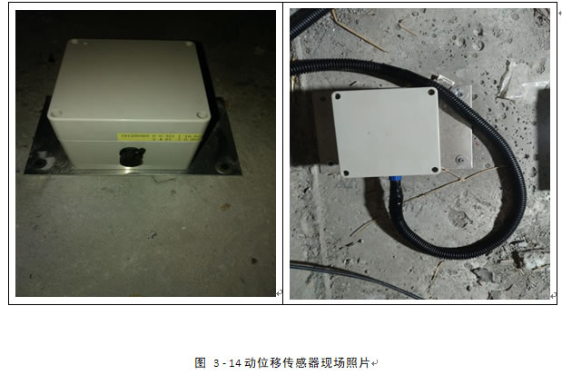 (2)安装动位移传感器。将动位移上方钢板与箱梁底部膨胀螺丝对齐从钢板孔中穿过,拧紧膨胀螺丝螺母,将四个角用螺母固定。