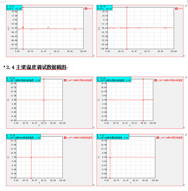 整个系统安装完成后,采用单机版软件在桥上对所有信号进行调试。分别采集了应变、动位移、温度以及裂缝信号,确保所有通道的正常运行。通过现场调试,初步判断通道测点G1,G3,G4信号存在异常。