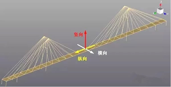 桥梁空间坐标:大桥长度方向为X方向,也称为纵向;宽度方向为Y方向,也称为横向;高度方向为Z方向,也称为竖向,如下图所示。